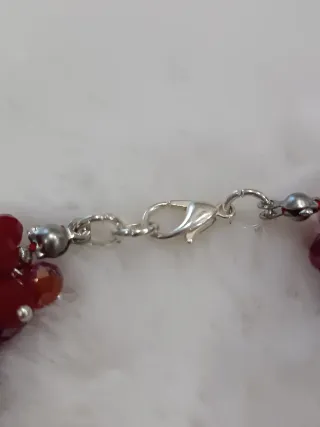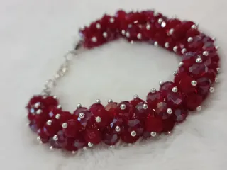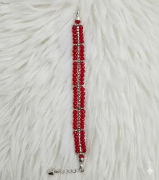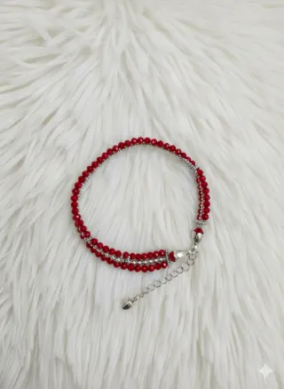 Elegante bracciale con doppia fila di cristalli rossi e piccole perline argentate. - Cristalli rossi sfaccettati. - Dettagli in ematite color argento. - Chiusura a moschettone regolabile.