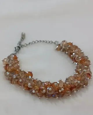 Elegante bracciale ispirato allo stile Bridgerton, realizzato con cristalli color ambra. - Cristalli sfaccettati che catturano la luce. - Dettagli con piccole perline argentate. - Chiusura a moschettone regolabile.