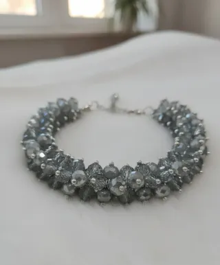 Elegante bracciale ispirato allo stile Bridgerton, realizzato con cristalli luminosi. - Cristalli sfaccettati color ghiaccio. - Dettagli metallici color argento. - Design multistrato.
