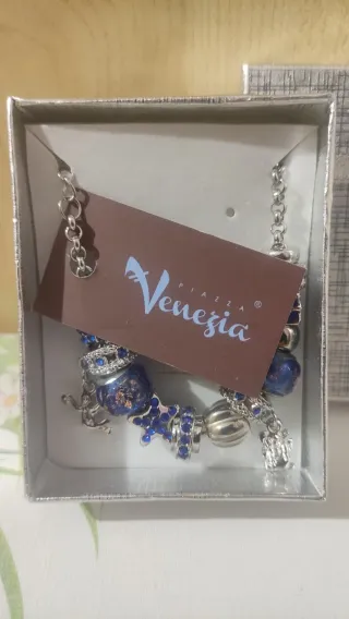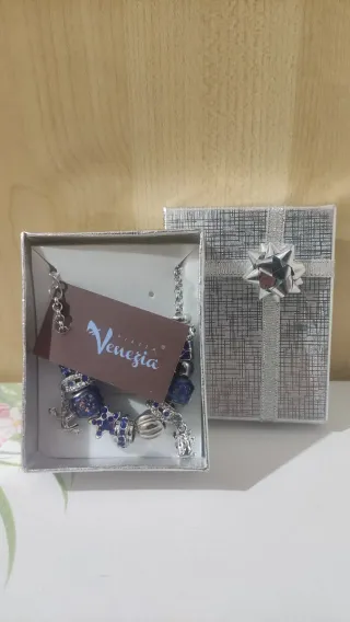 Bracciale di bijoux con vari ciondoli in acciaio e col blu. Nuovo con confezione. Regolabile al polso. - Dettagli blu scintillanti. - Chiusura a moschettone.