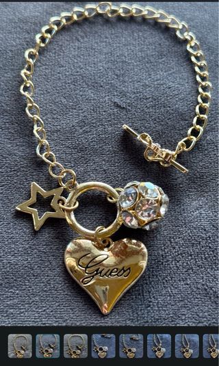 Elegante bracciale Guess con ciondoli a forma di cuore e stella. - Ciondolo a forma di cuore con scritta Guess. - Ciondolo a forma di stella. - Elemento sferico decorato con strass. - Chiusura a T.