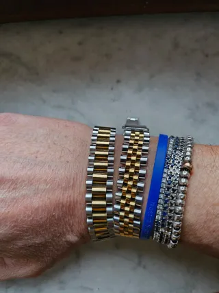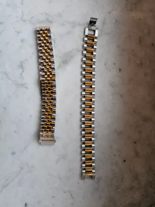 Elegante bracciale in stile Jubilee, un accessorio che aggiunge un tocco di classe. Chiusura deployante. - Design bicolore oro e argento. - Maglie lucide e ben rifinite. Disponibile anche modello president. Prezzo affare
