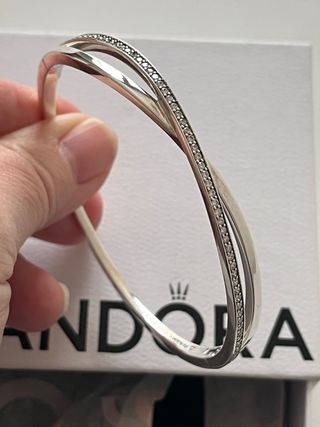 Elegante bracciale rigido Pandora in argento, impreziosito da zirconi scintillanti. - Design intrecciato e luminoso. - Finitura in argento lucido.
