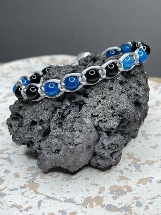 Elegante bracciale realizzato con cordino nero intrecciato e perline. ✨ - Perline in pietra naturale. - Dettagli con perline argentate. - Chiusura regolabile con bottone argentato. Misura bracciale: 18 cm 📏 #Inter #bluenero #neroeblu #bracciale #braccialetto #pietre #naturali #calcio