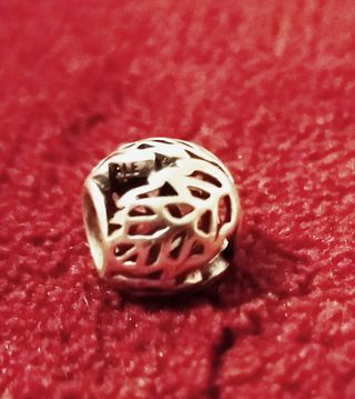 Charm per bracciale componibile Pandora, modello openwork foglia. Originale (infatti è presente l'incisione ALE), in argento. Come nuovo.