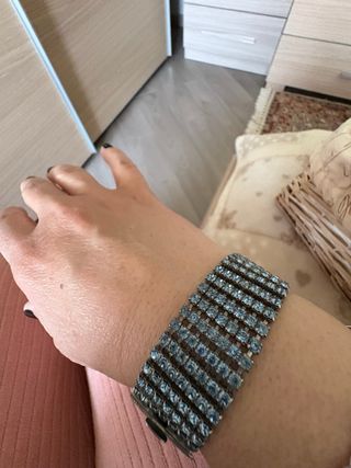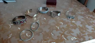 Tre bracciali, due in acciaio lisci, uno completamente ricoperto di strass. Pesano complessivamete 66 grammi. Vedi foto per la misura.