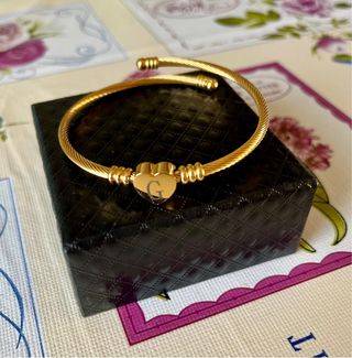 Bellissimo braccialetto rigido in metallo color argento. - Elegante ciondolo a forma di cuore con iniziale incisa. - Un secondo ciondolo a cuore. - Chiusura magnetica. - Perfetto come regalo.