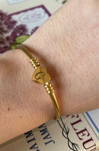 Elegante bracciale a fascia rigida con un ciondolo a forma di cuore. Il cuore è decorato con l'iniziale G incisa. - Design a fascia rigida - Ciondolo a forma di cuore - Incisione iniziale G