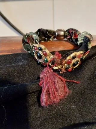 Bracciale artigianale in stile boho chic, realizzato con velluto damascato e impreziosito da pietre ed elementi etnici. - Nappina decorativa in tessuto rosso.