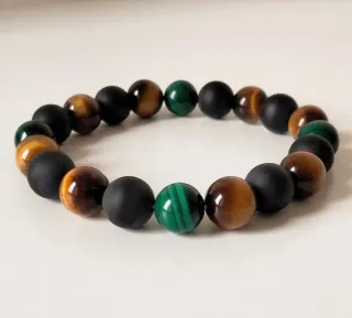 Bracciale elastico con bellissime pietre di alta qualità. Malachite naturale (4 pietre), occhio di tigre naturale (8 pietre) e onice nero opaco (8 pietre), da 10 mm. 👉 Per polsi da 16 a 17,5 cm di circonferenza. 👈 ALTRI BRACCIALI NEL MIO PROFILO. # uomo # donna.