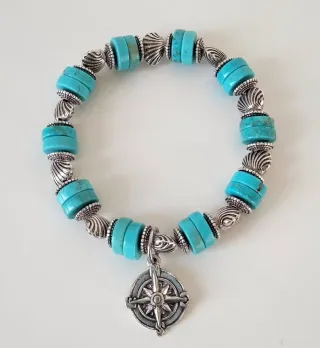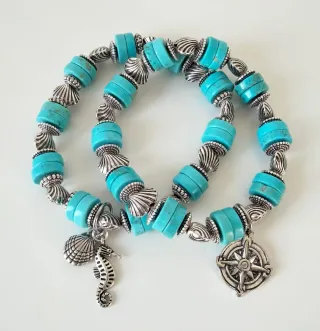 PREZZO CADAUNO. (Per entrambi euro 30,00). Bracciali elastici con rondelle in pietra turchese naturale stabilizzato da 10x3mm. Perline, ciondoli e conchiglie in metallo color argento anticato senza nichel e piombo. 👉 Per polsi fino a 16,5 cm di circonferenza. 👉 Stabilizzato significa che la pietra ha subito un processo per cui il colore turchese non ossidi nel tempo diventando più verde a causa dei minerali naturalmente presenti. ALTRI BRACCIALI NEL MIO PROFILO. # donna