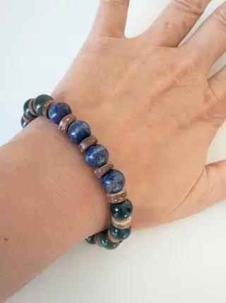 Bracciale elastico realizzato con pietre di lapislazzuli e agata muschiata naturali, da 10mm. Rondelle in guscio di cocco naturale. Made in Italy. 👉 Per polsi da 16,5 a max 18 cm di circonferenza. ✨ Il lapislazzuli è collegato principalmente al chakra della gola (il quinto) e al chakra del terzo occhio (il sesto). È una pietra che supporta la comunicazione e l'espressione personale ed è nota per la sua capacità di stimolare l'intuizione e la saggezza. ALTRI BRACCIALI NEL MIO PROFILO. # uomo