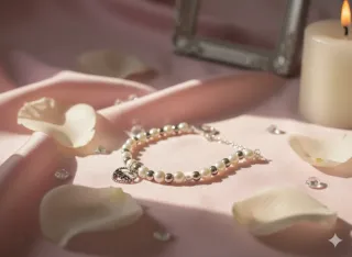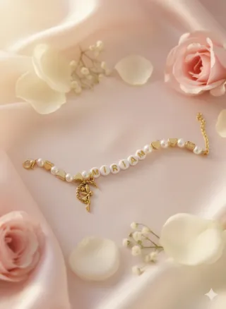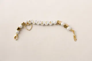 Delicato bracciale personalizzato con perle e dettagli a forma di cuore. - Perle bianche. - Ciondolo a forma di cuore. - Chiusura a moschettone dorata. - Estensione regolabile.