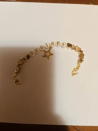Bellissimo braccialetto personalizzato con il nome DESIREE e un ciondolo a forma di stella. - Perline bianche con lettere dorate. - Ciondolo a forma di stella dorata. - Catena e chiusura dorate con cuoricini.