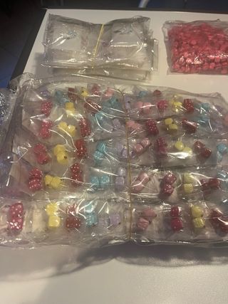 Lotto di orecchini , braccialetti e collanine di bigiotteria. Orecchini già montati e da montare kg. 5,5 Circa 200 orecchini montati con dadini Circa 60 orecchini montatti con soggetti - Orecchini neri - Orecchini verdi - Orecchini rosa - Orecchini bianchi - Orecchini gialli Tutto da montare (dadi di 3 dimensioni)