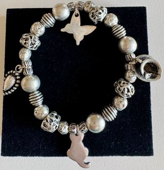 Elegante bracciale con diversi ciondoli decorativi. - Ciondolo a forma di gatto. - Ciondolo a forma di farfalla. - Perline in metallo color argento con varie texture. - Dimensioni circonferenza: 16,00 cm.