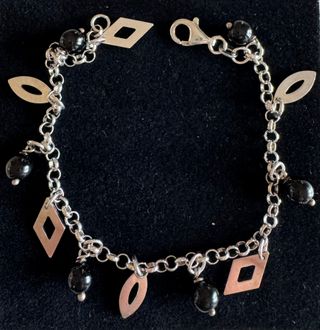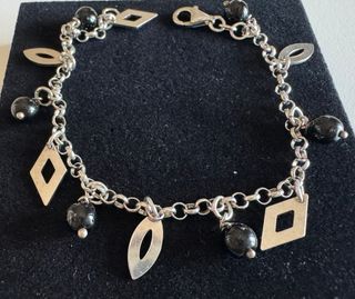 Elegante bracciale con diversi ciondoli. - Ciondoli a forma di rombo. - Ciondoli a forma di foglia. - Perle nere. - Chiusura a moschettone. - Dimensioni circonferenza: 18,00 cm.