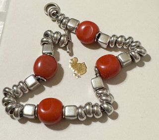 LEGGERE E VISIONARE TUTTE LE FOTO PRIMA DI CONTATTARE Bellissimo bracciale Dodo composto da rondelle bold, pepite in resina color corallo e cubotti Rubinia. - Misura evidenziata - Elementi in resina di colore rosso. - Cubotti in metallo color argento. - Brise’ in oro giallo 18 kt - NON TRATTABILE