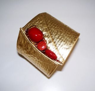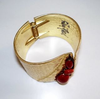 Elegante bracciale da donna con finitura dorata e dettagli in pietre rosse. - Design unico e accattivante. - Finitura martellata effetto oro. - Incastonatura di pietre rosse lucide.