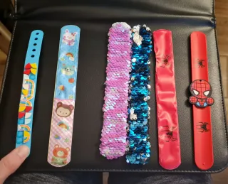 Set di bracciali slap per bambini con diverse fantasie. Perfetti per aggiungere un tocco di allegria. - Bracciale tipo Lego azzurro con parti geometriche staccabili. - Bracciale con coniglietto, arcobaleni e orsetto. - Bracciale con paillettes reversibili rosa. - Bracciale con paillettes reversibili blu. - 2 bracciali rossi con ragni e personaggio Spiderman.