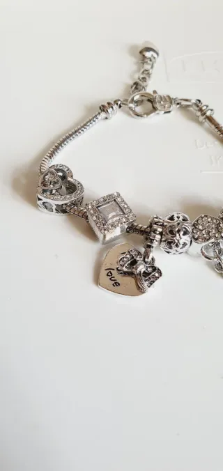Bellissimo bracciale con diversi ciondoli, perfetto per aggiungere un tocco di stile. - Ciondolo a forma di cuore con scritta love. - Ciondolo a forma di chiave. - Ciondoli decorati con strass. - Chiusura a moschettone.