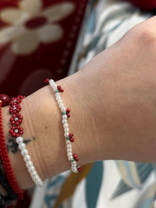 Delicato braccialetto realizzato a mano con perline. Un accessorio unico che aggiunge un tocco di colore. - Design con fiorellini rossi. - Inserti di perle bianche. - Chiusura a moschettone.