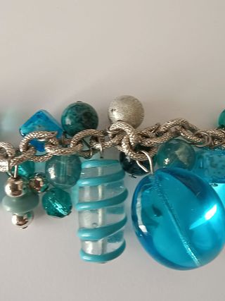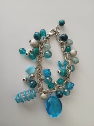 Bellissimo bracciale con un mix di perle e elementi decorativi. - Perle di varie forme e dimensioni. - Elementi a catena in argento. - Charm pendenti. - Design unico e colorato.