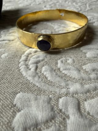 Elegante braccialetto in ottone con una pietra celeste incastonata. La finitura martellata aggiunge un tocco unico. - Materiale: Ottone - Pietra: Celeste - Finitura: Martellata