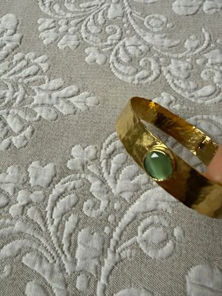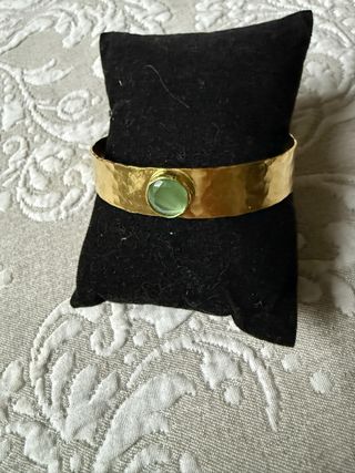 Elegante bracciale in ottone con una pietra verde incastonata al centro. Un accessorio che aggiunge un tocco di colore e raffinatezza. - Materiale: Ottone - Pietra: Verde