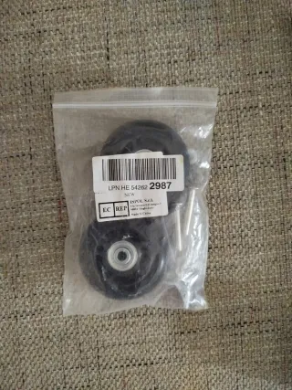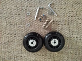 Set di ruote di ricambio per valigia. - Due ruote nere con dettagli argentati. - Include viti e chiavi per il montaggio.
