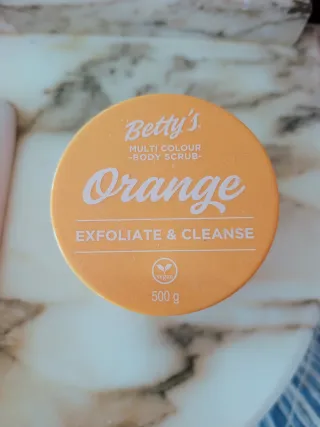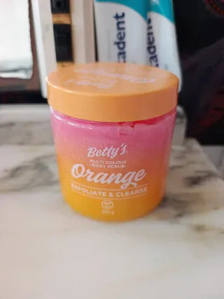 Scrub corpo Betty's al profumo di arancia, con una texture multi-colore che sfuma dal rosa all'arancione. - Contenitore da 500 g. - Ideale per esfoliare e detergere la pelle.