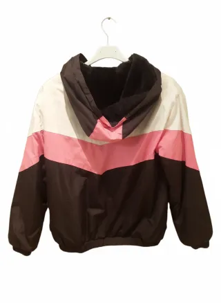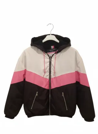 Giacca bomber con un design a blocchi di colore. - Design a chevron con pannelli bianchi, rosa e neri. - Cappuccio con coulisse. - Tasche frontali con zip.