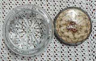 Elegante portagioie vintage con coperchio ricamato a petit point - floreale. - Coperchio in tessuto ricamato con rose. - Bordatura metallica lavorata. - Base in vetro trasparente con motivi incisi.