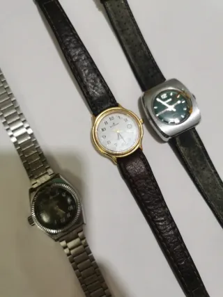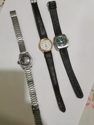Tre orologi da polso, uno con cinturino in pelle marrone e cassa dorata, uno con cinturino in pelle grigia e cassa argentata, e uno con cinturino in metallo argentato. - Orologio con quadrante bianco e indici dorati. - Orologio con quadrante verde e indici argentati. - Orologio con quadrante scuro e indici chiari. Vendo per non funzionanti