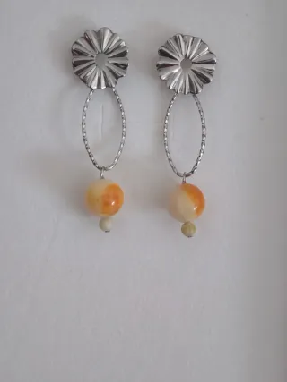 Eleganti orecchini realizzati in acciaio con pietre dure naturali calcite arancio - Design floreale sulla parte superiore. - Elemento ovale centrale di acciaio martellato - Pendente con pietra principale di calcite arancione - Materiali: Acciaio e pietre dure naturali. Nuovi. Sconti per più articoli acquistati insieme. SPEDISCO SOLO CON POSTE ITALIANE E INPOST /LOCKER E FERMOPOINT BRT