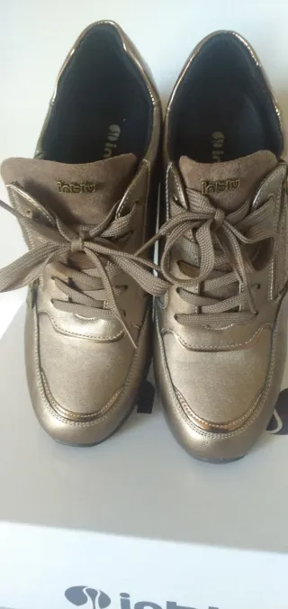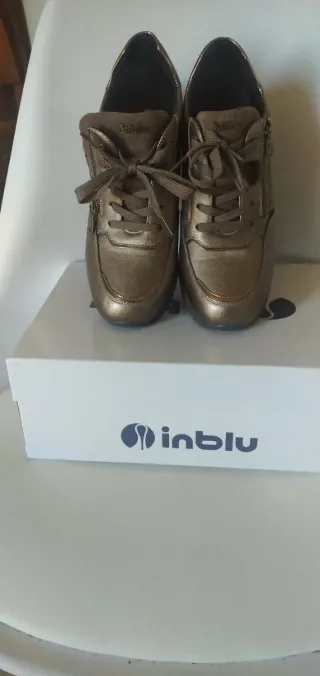 Eleganti scarpe Inblu da donna, numero 39, con una finitura metallica dorata che le rende uniche. - Design moderno e versatile. - Chiusura con lacci per una calzata personalizzata. - Dettaglio zip laterale.