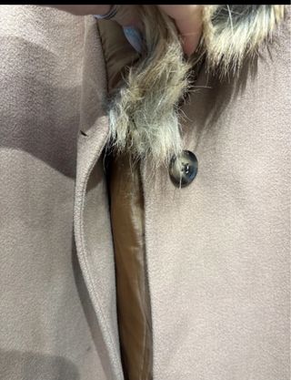 Elegante cappotto color beige con dettagli in pelliccia. - Collo in pelliccia sintetica. - Polsini in pelliccia sintetica. - Cintura in vita. Unico difetto, fodera della tasca scucita