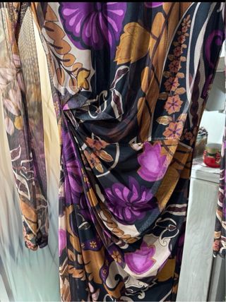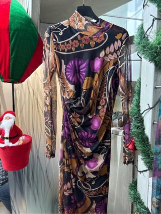 Elegante abito lungo con una vivace fantasia floreale. - Tessuto leggero e trasparente. - Scollo alto. - Maniche lunghe. - Dettaglio drappeggiato in vita.