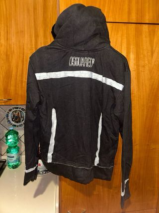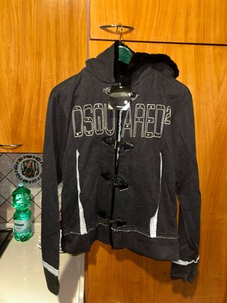 Felpa Dsquared2 con cappuccio e dettagli in pelliccia sintetica. - Chiusura con alamari. - Logo Dsquared2 stampato sul davanti. - Inserti bianchi a contrasto. - Polsini e fondo a costine.