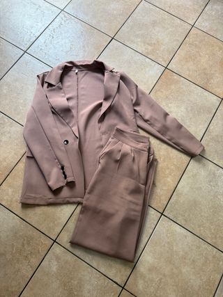 Elegante completo composto da blazer e pantalone. - Blazer monopetto con chiusura a bottone. - Pantaloni con pinces. - Tessuto fluido.