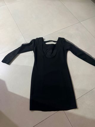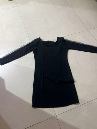 Elegante abito tubino con un tocco di raffinatezza. - Maniche lunghe in tessuto trasparente con dettagli. - Design aderente che valorizza la figura. - Scollatura squadrata.
