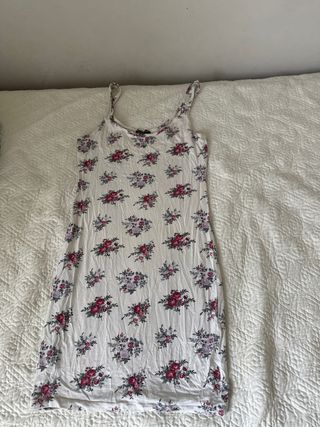 Vestitino con fantasia floreale. - Spalline sottili. - Tessuto leggero e confortevole. - Stampa di fiori rossi e viola su fondo bianco.