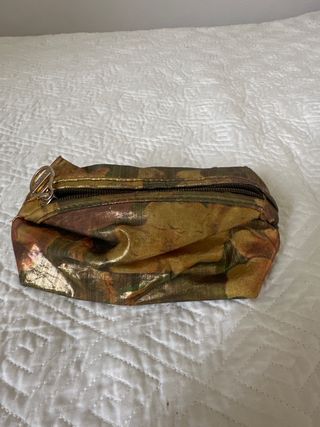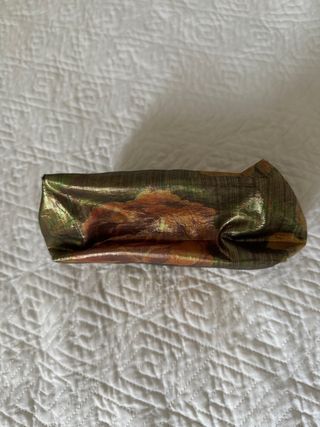 Beauty case con una fantasia di colori che ricordano l'oro e sfumature multicolore. La chiusura è con cerniera. - Materiale lucido e cangiante. - Design compatto.