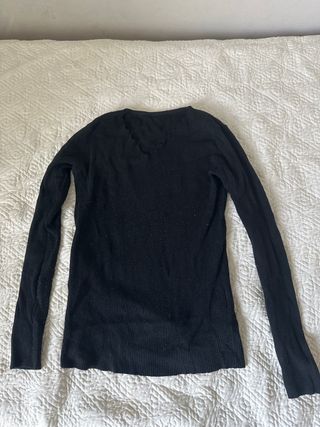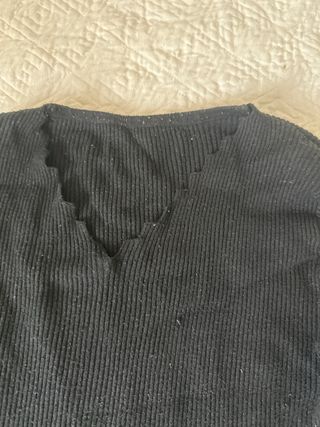 Maglietta nera a maniche lunghe con scollo a V seghettato - Tessuto a costine. - Dettaglio scollo a V con bordo ondulato.