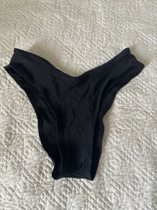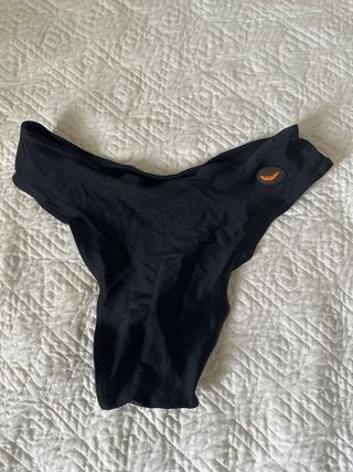 Brasiliana in tessuto nero con un simpatico dettaglio a forma di papaya arancione. - Design a vita alta. - Dettaglio papaya sul lato.