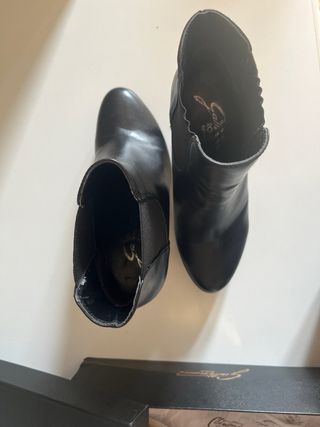 Elegante tronchetto in pelle nera con inserti elastici laterali. - Tacco largo e plateau. - Design moderno e versatile.