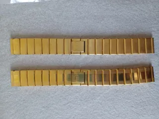 Set di tre cinturini per orologi vintage. Bracciale vintage nuovo in acciaio placcato oro ansa curva da 17 mm lunghezza 16 cm con possibilità di accorciarlo fino a 14 cm tramite i fori sulla chiusura. Disponibilità 5 bracciali, possibilità di acqyistarne anche uno solo. Cinturino perfetto per orologi vintage o moderni placcati o in oro 18 kt come. Adatto ad orologi vintage come Omega, Longines, Universal Geneve, cronografo. - Design a maglie bicolore. - Chiusura a scatto in metallo lucido. Nueva correa vintage de acero bañada en oro para relojes y cronógrafos. Bracelet neuf vintage en acier plaqué or pour montres et chronographes N