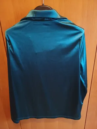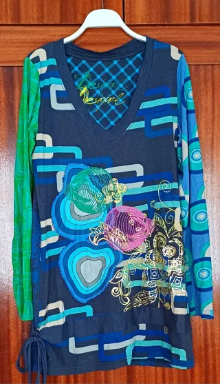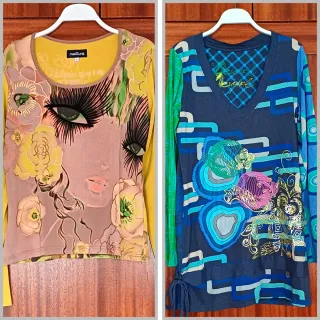 Due magliette a maniche lunghe con stampe uniche taglia L. La prima, in toni blu e dorati, è di Desigual. È più bassa del solito, ideale per leggings. Misure: 51 cm spalla e 79 cm altezza. Il prezzo è di 7 €. L'altra, giallo oro con dettagli in rame, è di Natura. Misure: 49 cm spalla e 54 cm altezza. Il prezzo è di 6 €. Se vuoi vederle indossate, possiamo incontrarci in un negozio e te le provi. - Maglietta Desigual con stampa geometrica e floreale in toni blu e verdi. - Maglietta Natura con design di volto e fiori in toni gialli e grigi. - Entrambe taglia L.