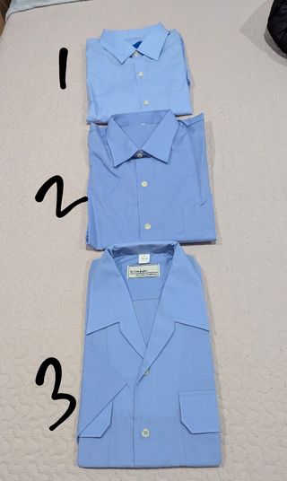 Camicie a 3€ l'unità. 1) Camicie blu cielo a manica lunga T-40, misura da ascella a ascella 58 cm, lunghezza 75 cm. 2) Camicie a manica lunga T-40, misura da ascella a ascella 58 cm, lunghezza 75 cm, manica 65 cm. 3) Camicie blu cielo a manica corta T-40, misura da ascella a ascella 58 cm, lunghezza 75 cm.