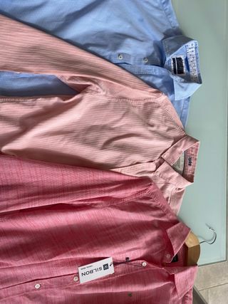 Set di tre camicie a maniche lunghe da uomo. - Camicia blu con micro stampa sfera - Camicia rosa con sottili righe Springfield - Camicia corallo con texture jaspeata SILBON nuova con etichetta slim fit